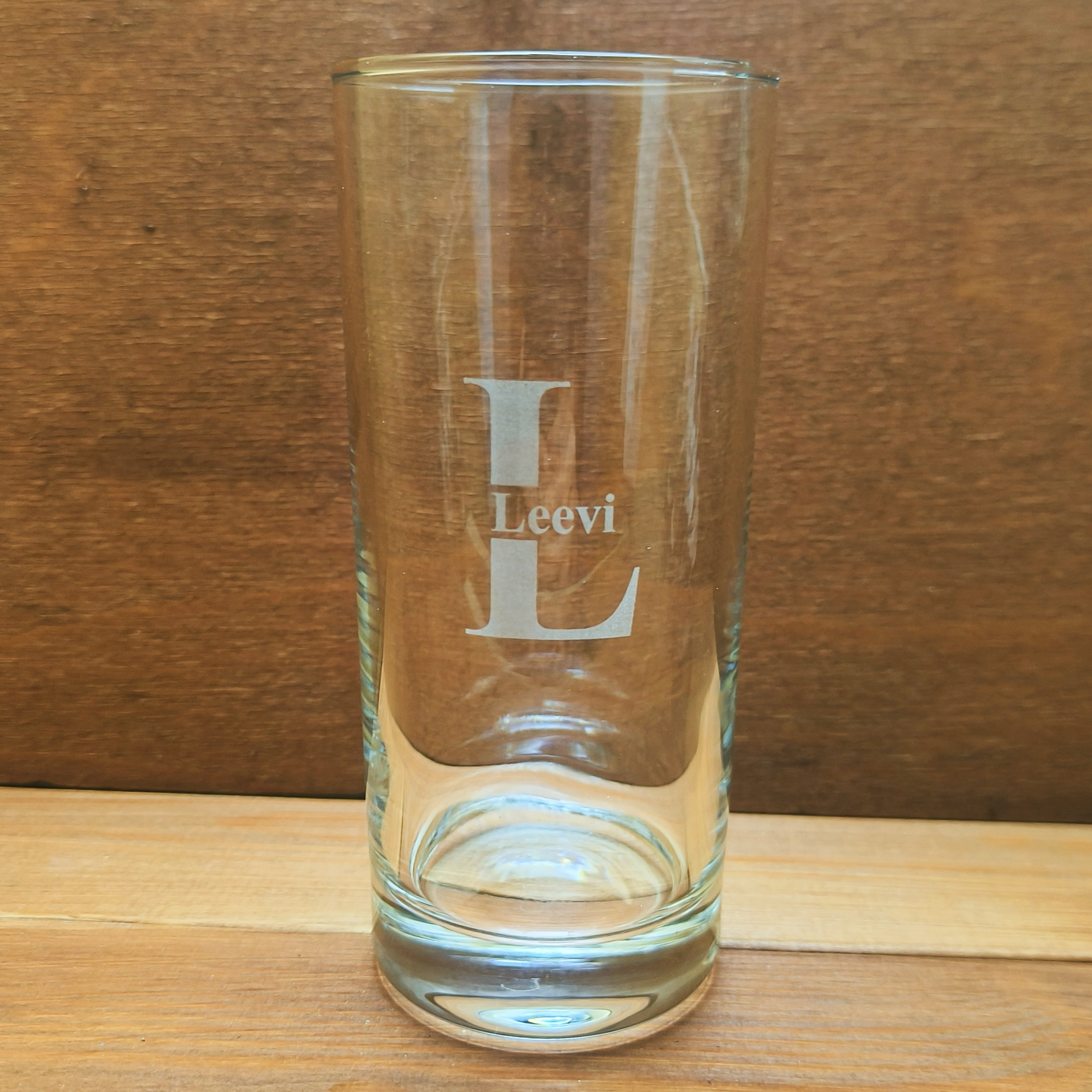 Pitkä juomalasi kaiverruksella on suunniteltu ja kaiverrettu Suomessa.