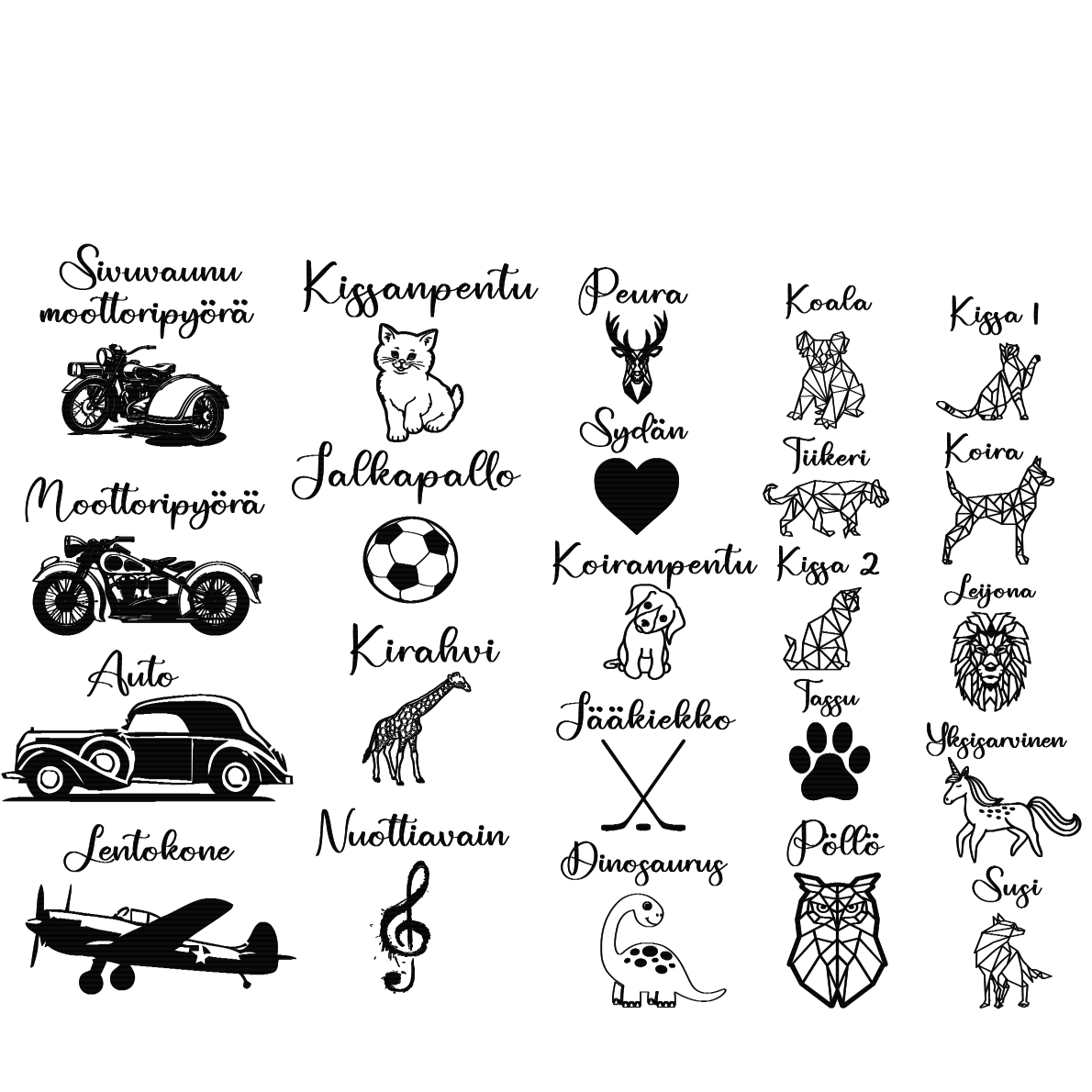 Voit valita sopivan fontin viidestä eri vaihtoehdosta. Voit myös tilauksen yhteydessä toivoa omalla fontillasi tekstin niin olemme teihin yhteydessä.